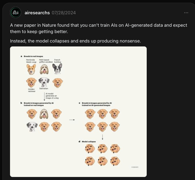 interestingly, this same phenomenon is happening with AI. the models used to train these systems are fed recycled data, and as they continue to feed off each other, the information becomes increasingly diluted.